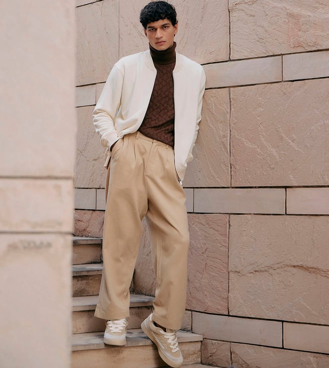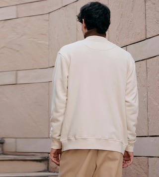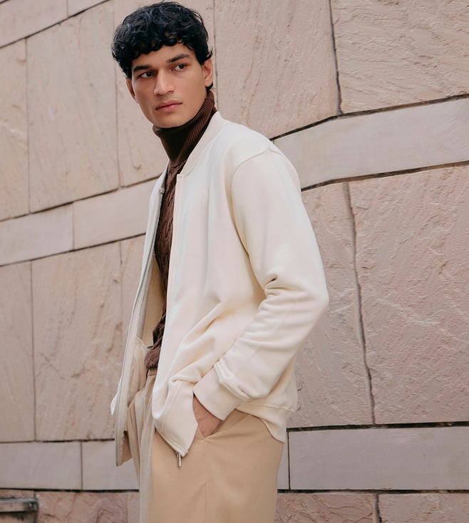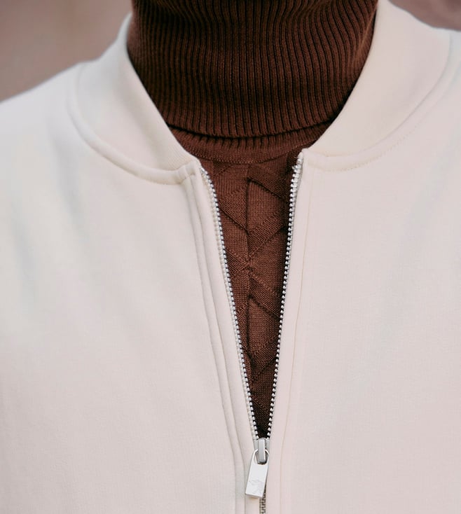 Minimal, sculptural, and precise. This off-white bomber brings softness to structure with a cotton-modal knit that feels substantial yet fluid. Subtle detailing and refined craftsmanship make it a modern icon of street luxury.