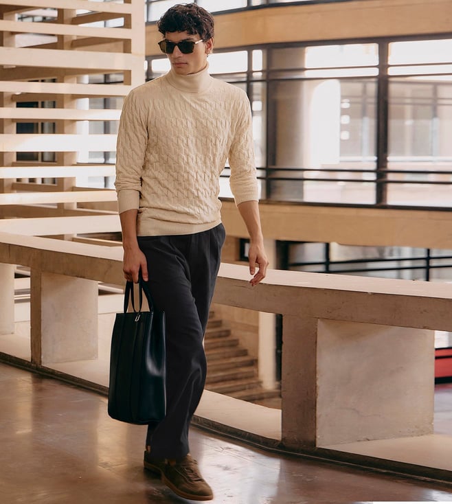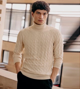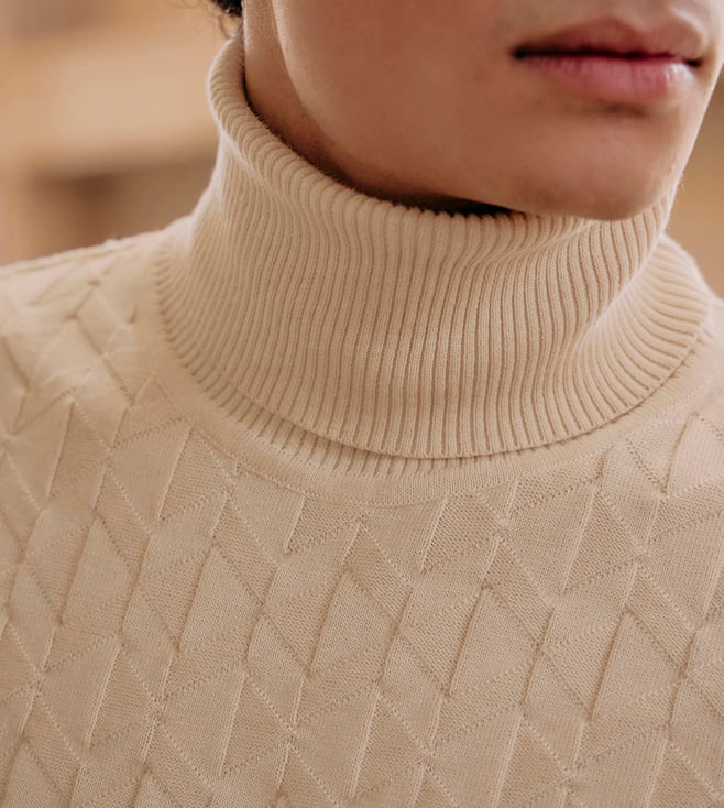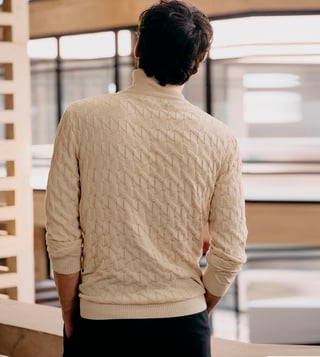 Pure restraint meets material mastery. This high-neck pullover, in a soft cotton-wool blend, delivers both warmth and breathability. Structured yet supple, it captures the balance between comfort and precision.