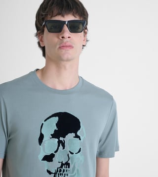 This men's t-shirt is made from pure cotton and features a regular fit with short sleeves and a round neck It has a graphic pattern and a pull on closure The fabric is stretchable and the placement print adds a unique touch to the design The green color is perfect for a casual and comfortable look.