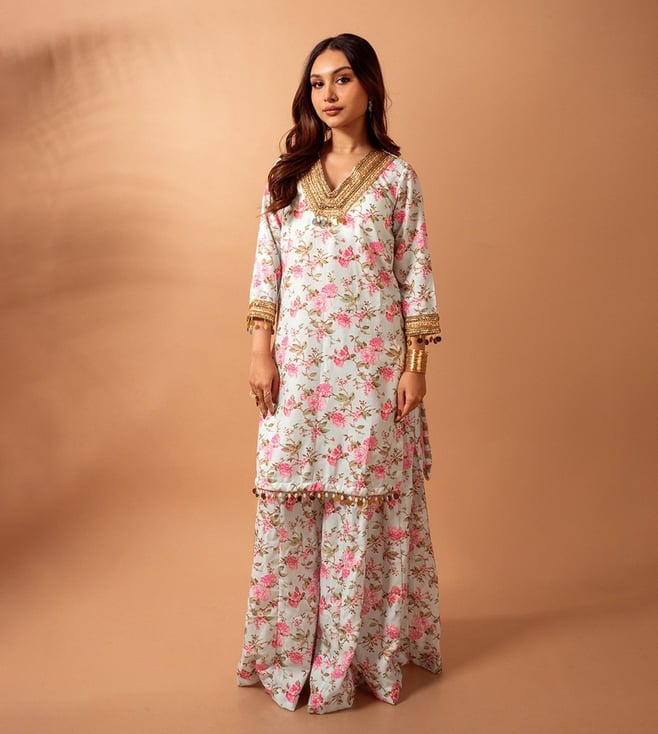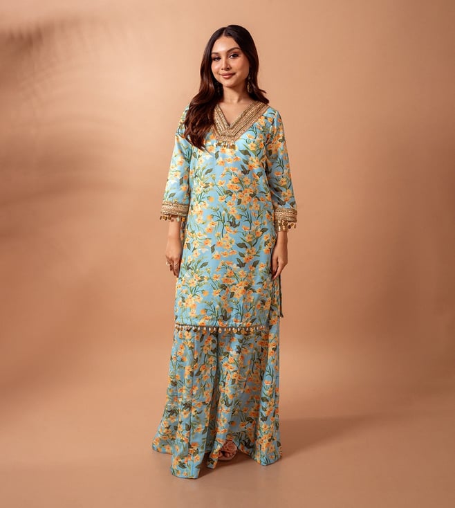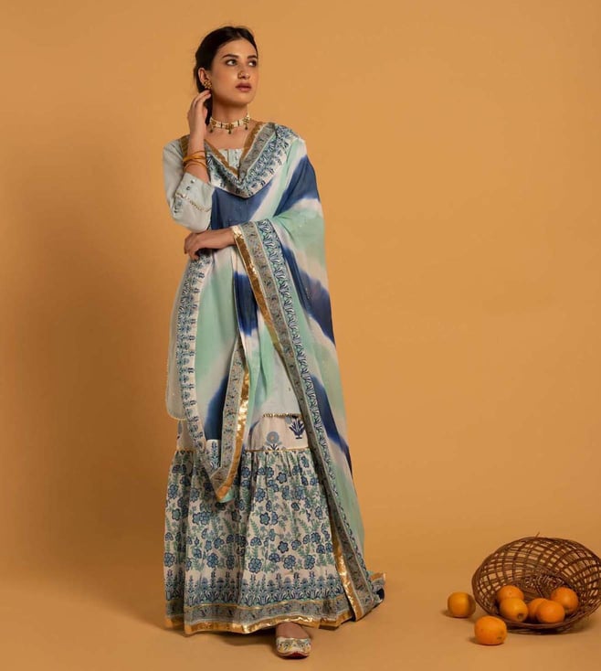 Powder Blue Dua Block Printed Kurta with Sharara and Dupatta