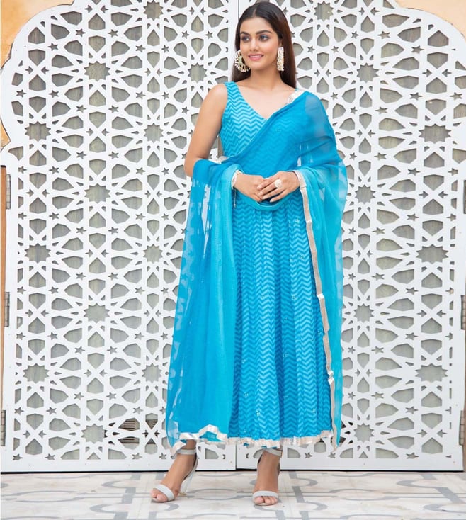 Blue Dua Mughal Boota Anarkali with Pant and Dupatta