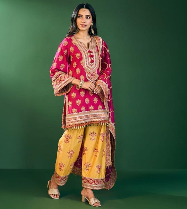 Fuchsia Satin Regular Fit Kurta with Pant & Dupatta