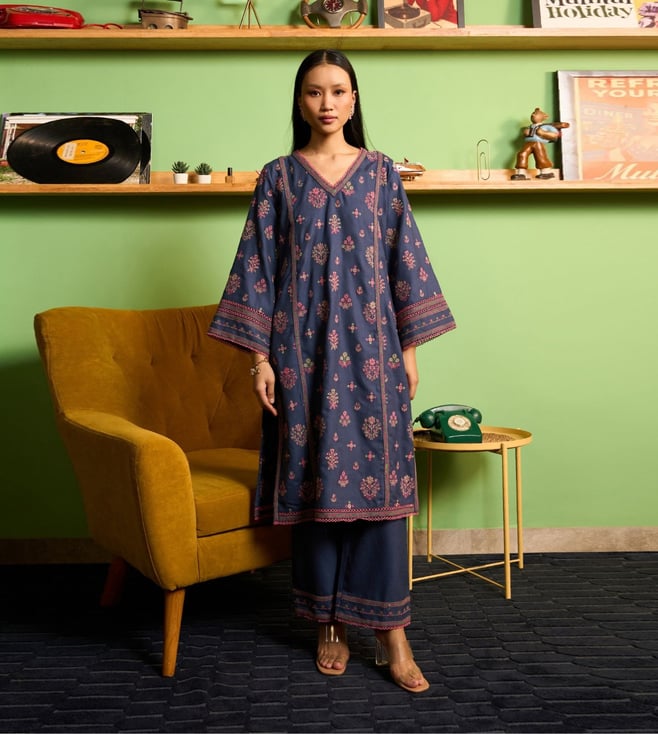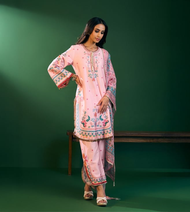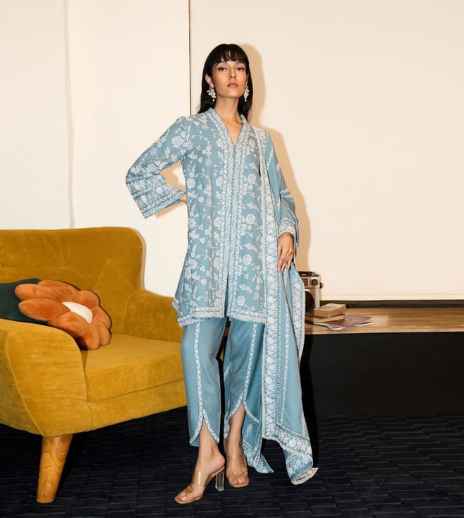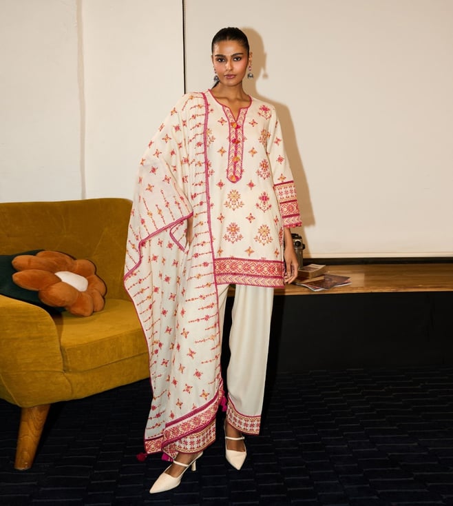 Off White Colette Embroidered Regular Fit Kurta Set With Colette Shawl