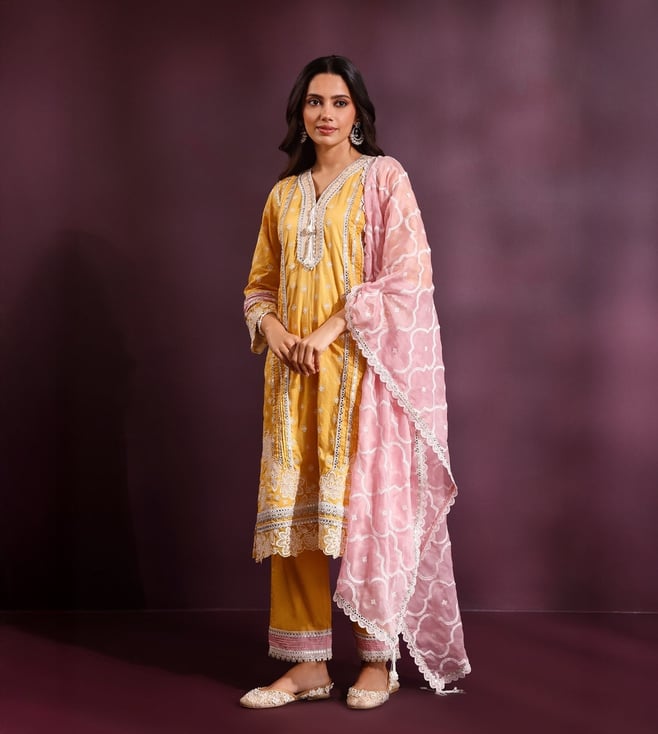 Mustard Pima Satin Kurta with Pant & Dupatta