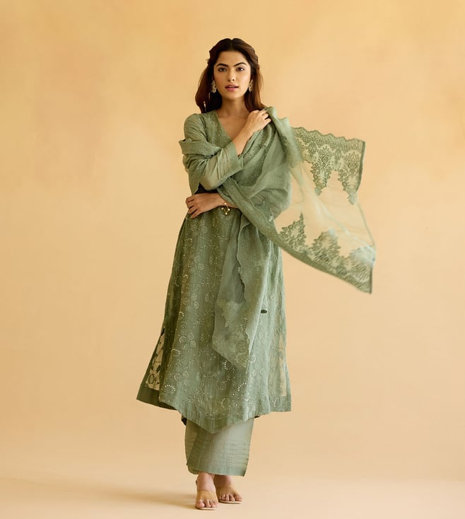 Muted Green Cotton Chanderi Comfort Fit Kurta,Pant And Dupatta Set