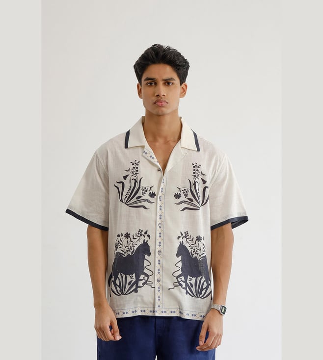 Off White Rayon Relaxed Fit Botanical Horse Shirt