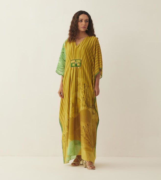 Dip Dye Yellow And Off-white Chanderi V-neck Embroidery Kaftan