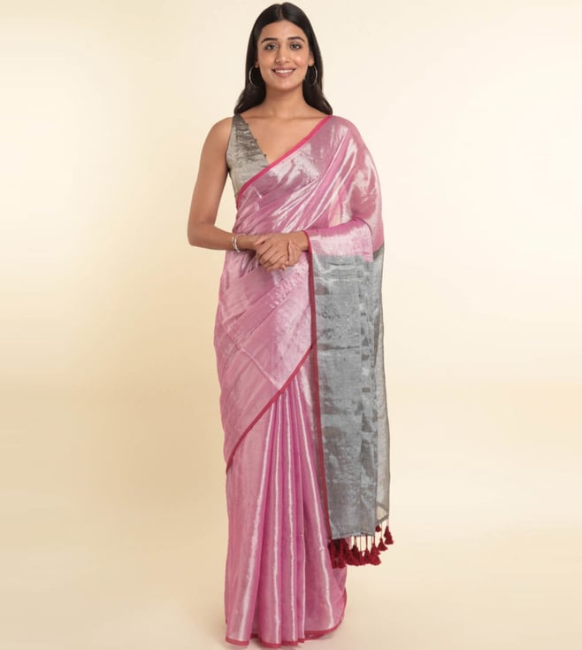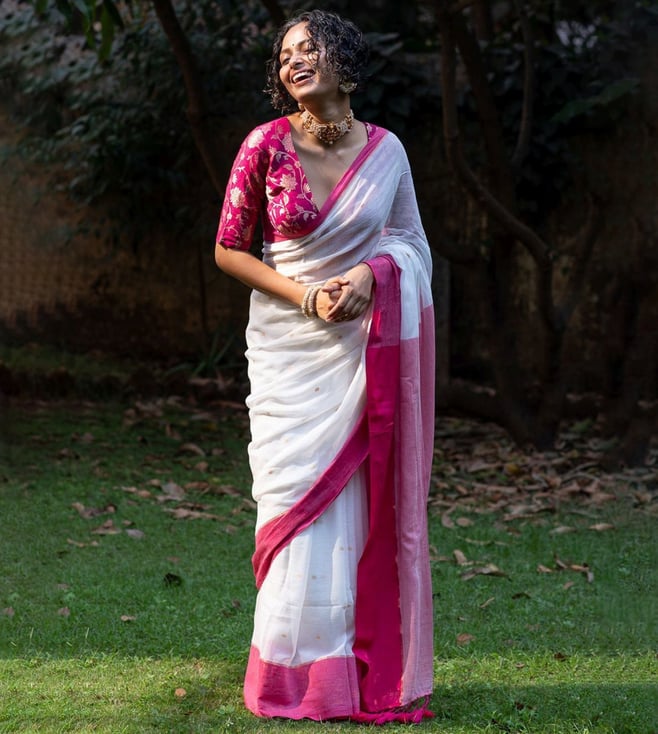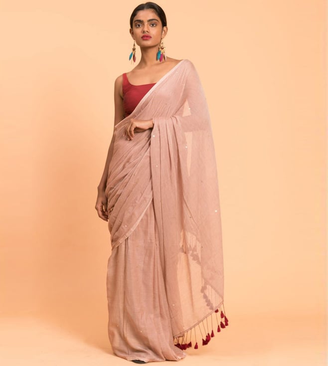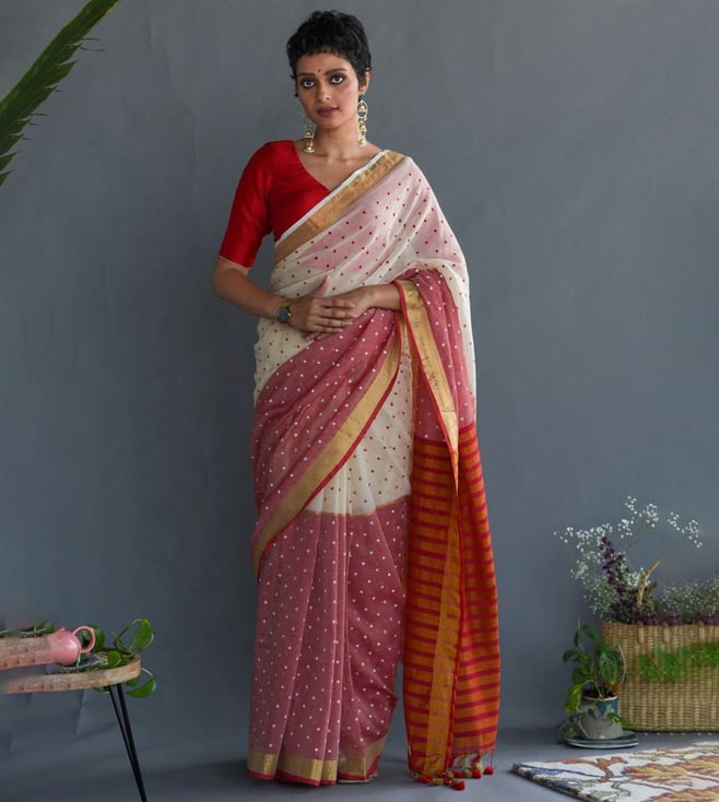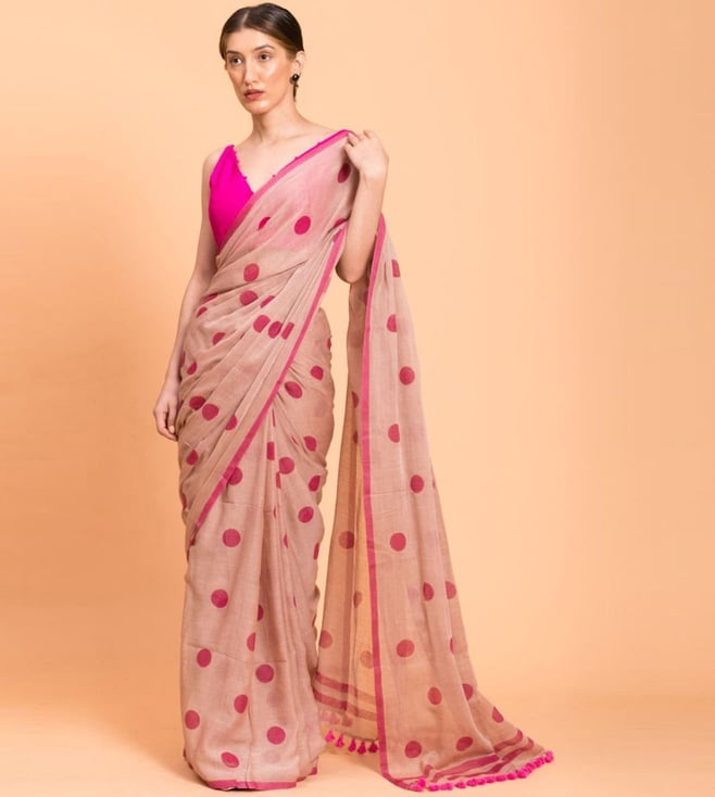 Beige & Pink Cotton Polka Dots Saree Without Blouse