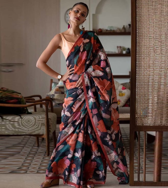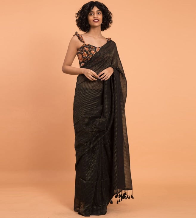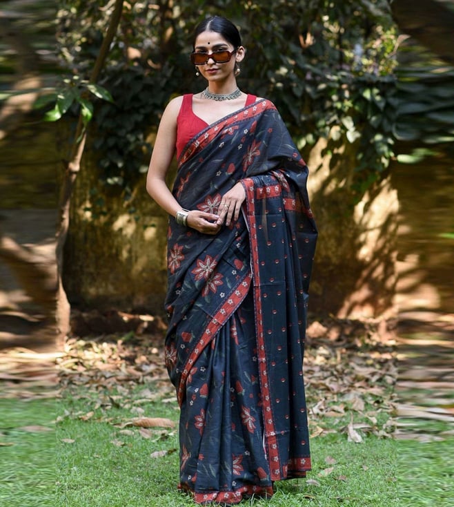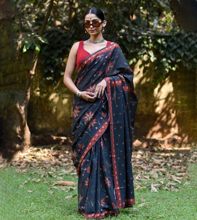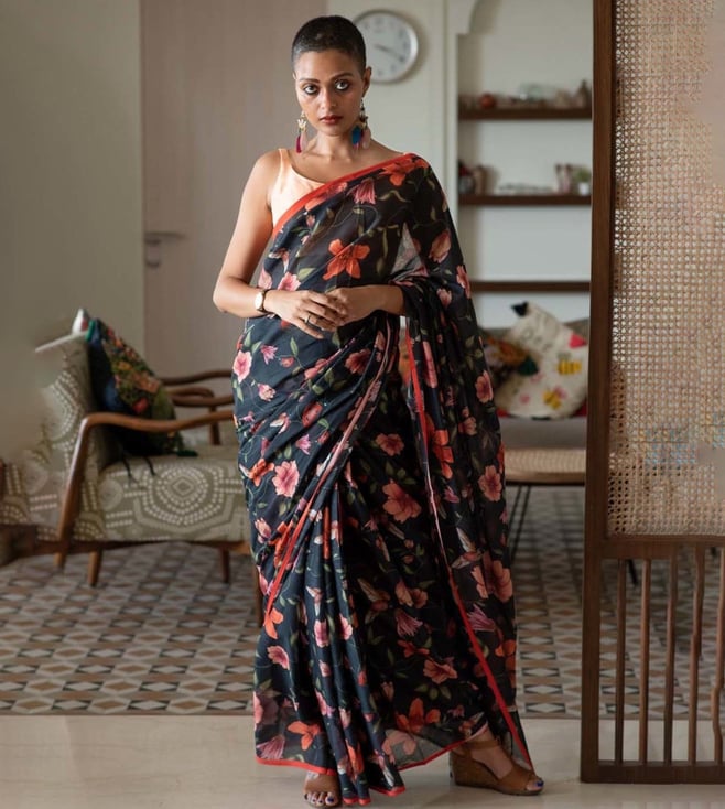 Black Cotton Floral Print Saree Without Blouse