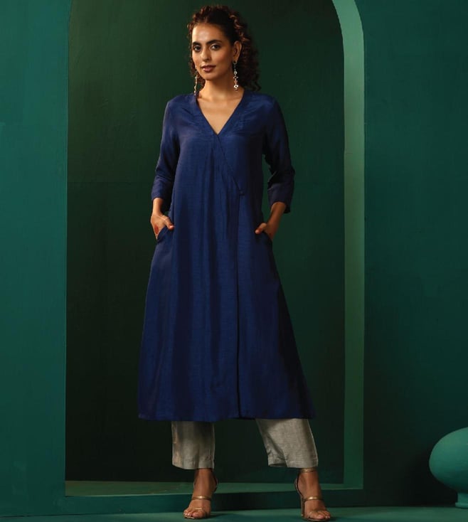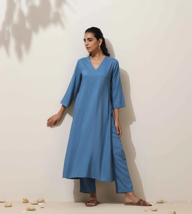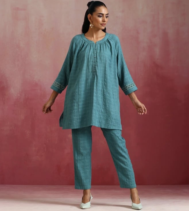 TrueBrowns Light Blue Cotton Dobby Kurta with Pant Co-ord Set