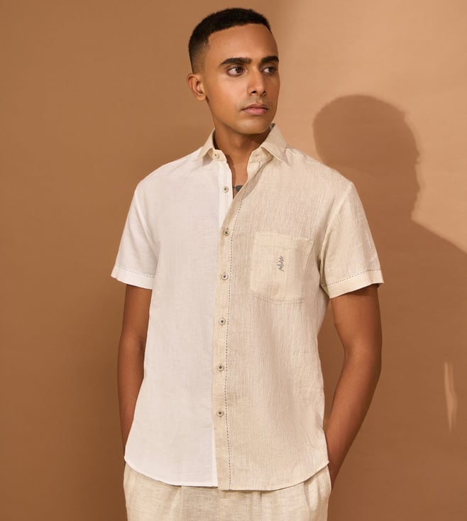White/Beige Cotton Linen Slim Solid Shirt