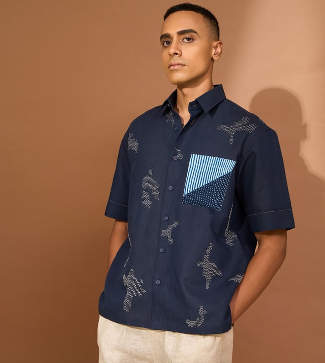 Indigo Linen Slim Patchwork Shirt