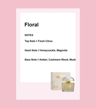 A subtle bloomy fragrance, with entrancing notes of fresh citrus, magnolia, honeysuckle and a sweet tangy raspberry accord ending with a base of cashmere wood, amber and musk.