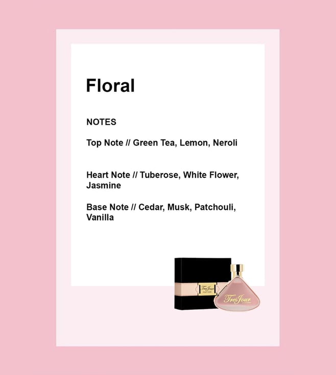 A floral scent with sparkling freshness of lemon, green tea and neroli with a floral heart of white flowers, tuberose and jasmine. The base is an invigorating mix of patchouli, vanilla, cedar and musk.