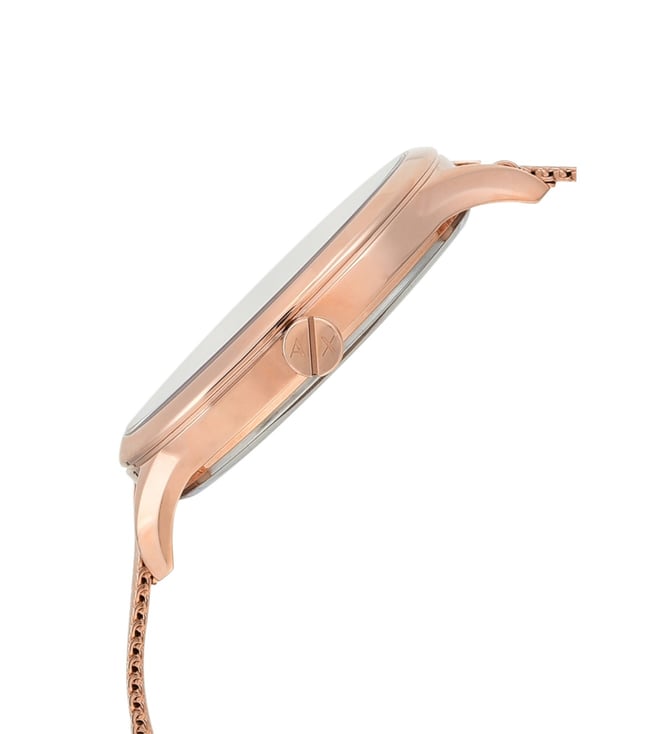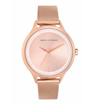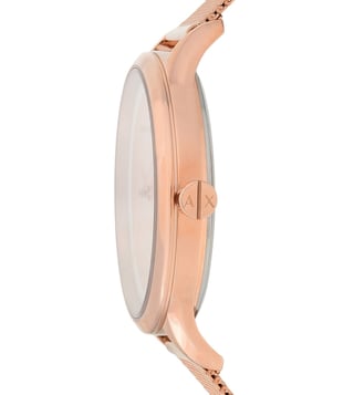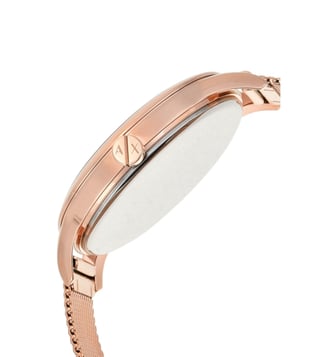 A must-have timepiece for all the watch aficionados, this women's analog watch from Armani Exchange will be a perfect pick. Its strap vaunts a rose gold hue that enhances the look of the watch. Housed in a case, the rose gold round dial is protected by a mineral glass. It showcases plain 3-hand, and a crown for time adjustment. Furthermore, it is complemented with a deployment clasp clasp that ensures a secure fit on the wrist.