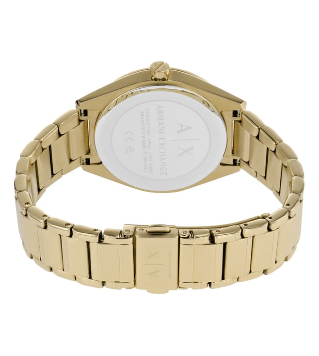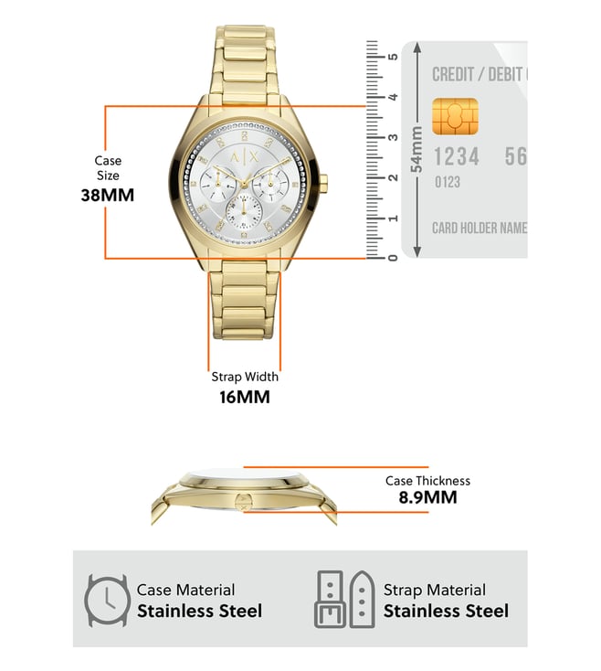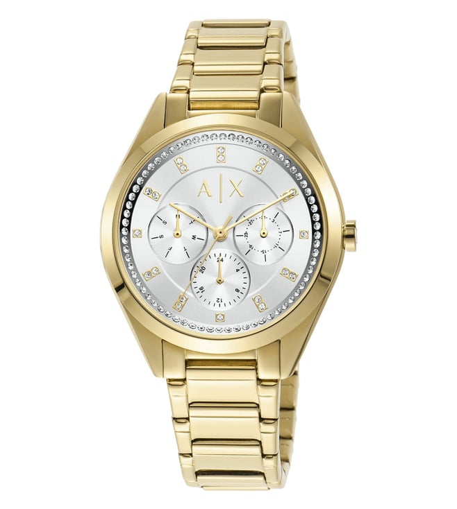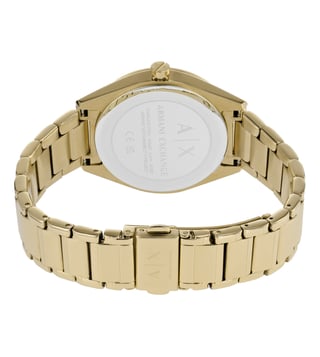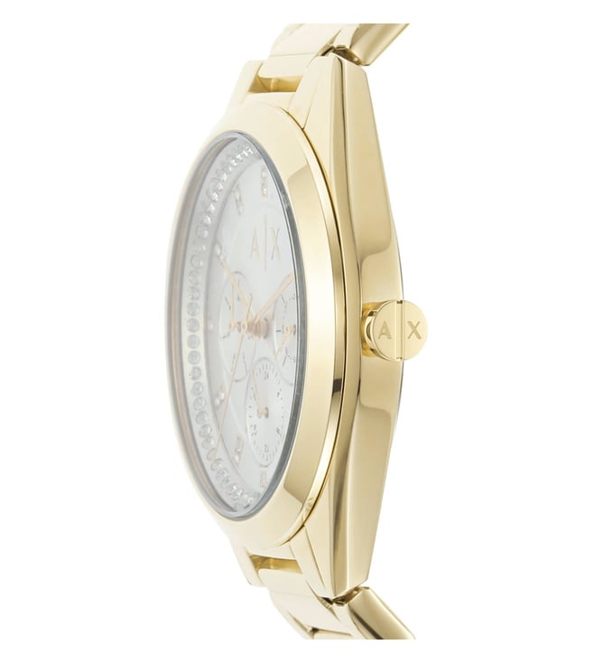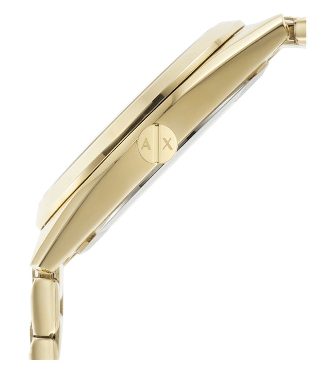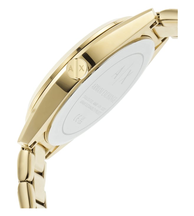 Look modish by donning this women's analog watch from Armani Exchange. Enclosed in a case, the mother of pearl round dial is secured by a mineral glass. It displays multifunction, and a crown for time adjustment. The strap showcases a gold hue that uplifts the look of the timepiece. Besides, it is finished with a push button clasp clasp that provides a secure fit on the wrist.