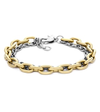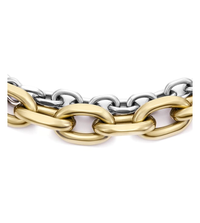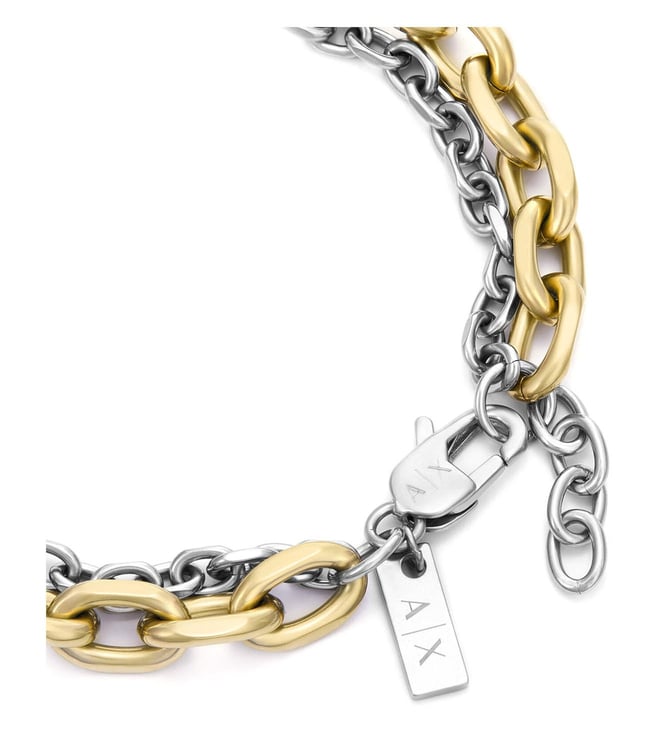 Matte gold-tone stainless steel contrasted against silver-tone links create an all-new double chain look from from Armani Exchange. The brushed finish enhances the modern texture, and the lobster clasp ensures a secure fit. Designed with clean lines and crafted from durable materials, this piece balances style with everyday wearability.