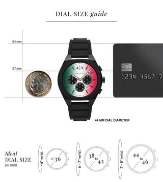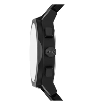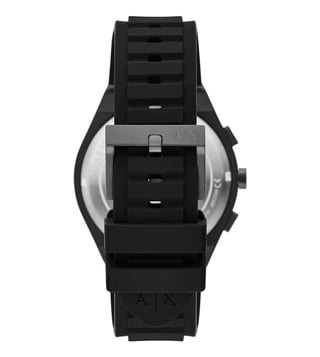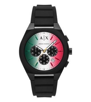 Armani Exchange 44mm watch. A matte multi color dial contrasts sharply against a black nylon case and matching black silicone strap, creating a streamlined, monochromatic design. Chronograph sub-dials add precision and functionality, while the single prong strap buckle ensures a secure fit. The large round case emphasizes its modern, sport-inspired aesthetic.