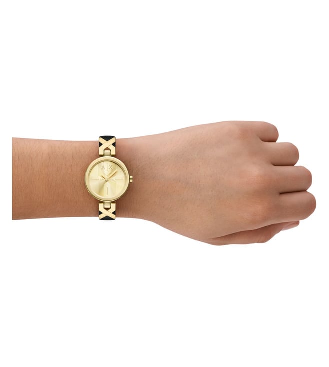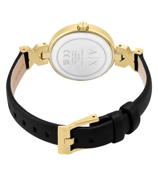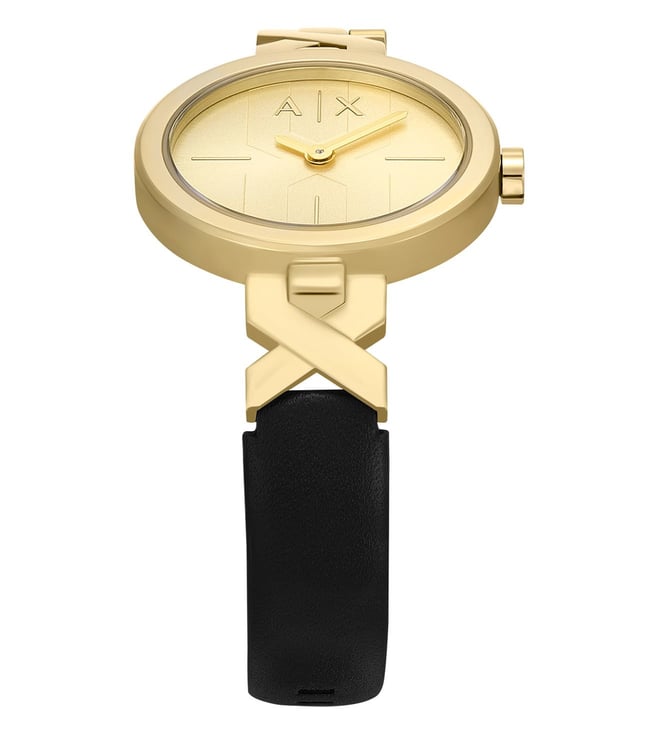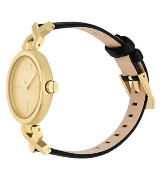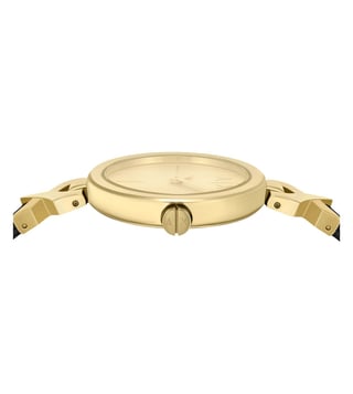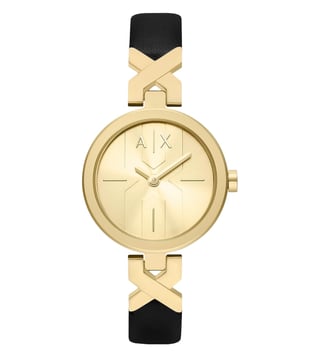A gold sunray dial catches the light with a subtle shimmer, framed by a polished gold-tone stainless steel case. The black leather strap adds a refined contrast, balancing texture and tone. With its minimalist two-hand design, this watch delivers effortless sophistication in a sleek, modern silhouette.
