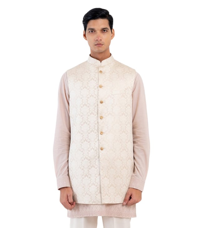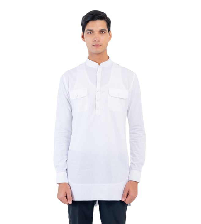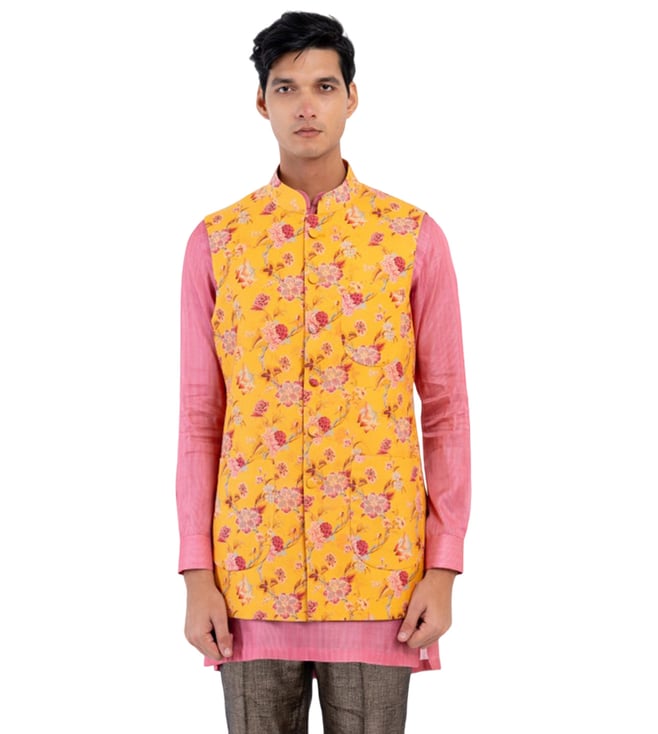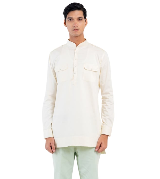 Butter Yellow Pathani Kurta With Piping And Round Hem At The Front