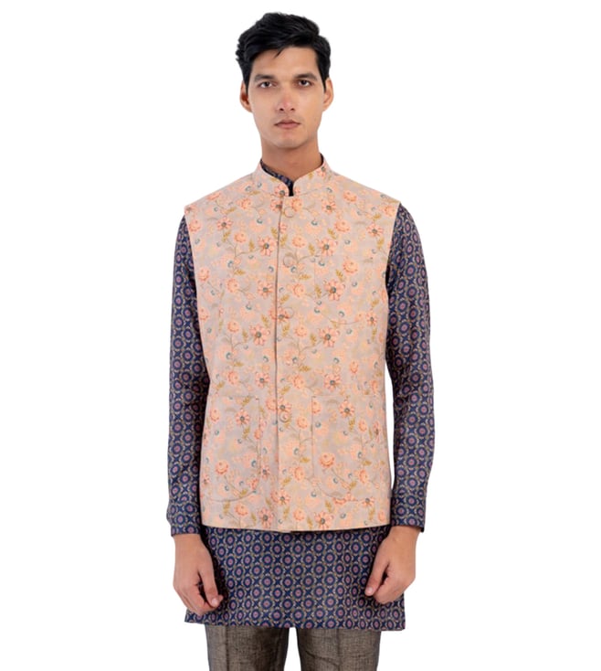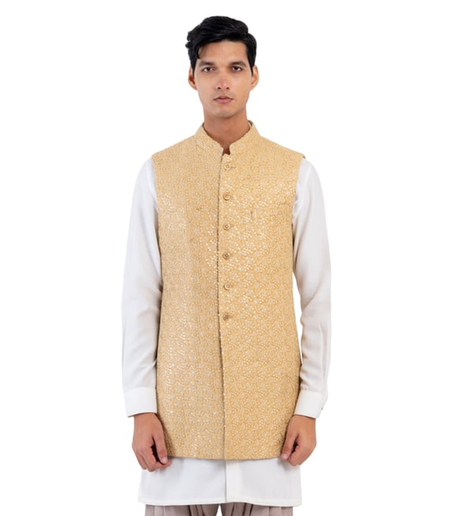 Light Mustard Floral All Over Sequin/Thread Embroidery Mid Thigh Sleeveless Jacket