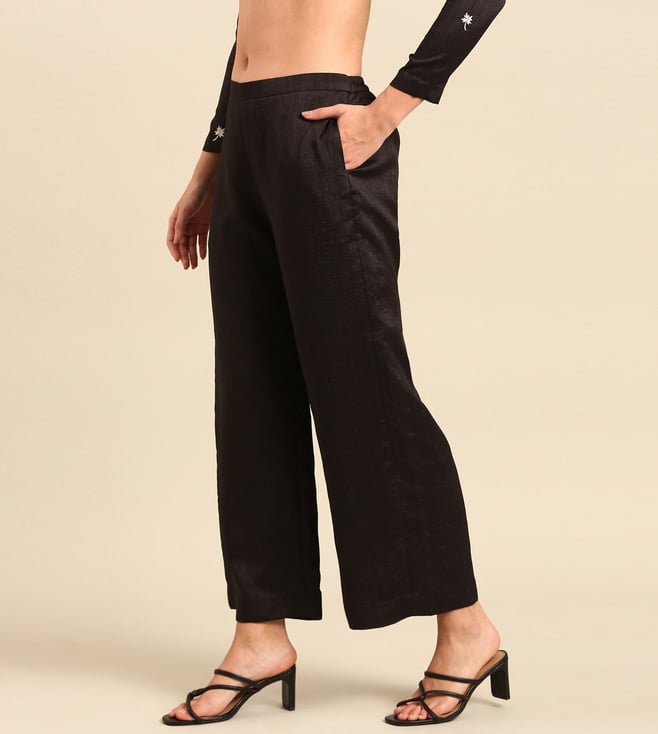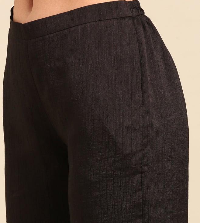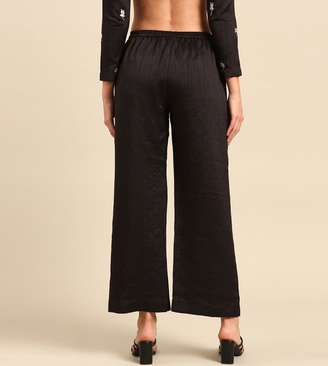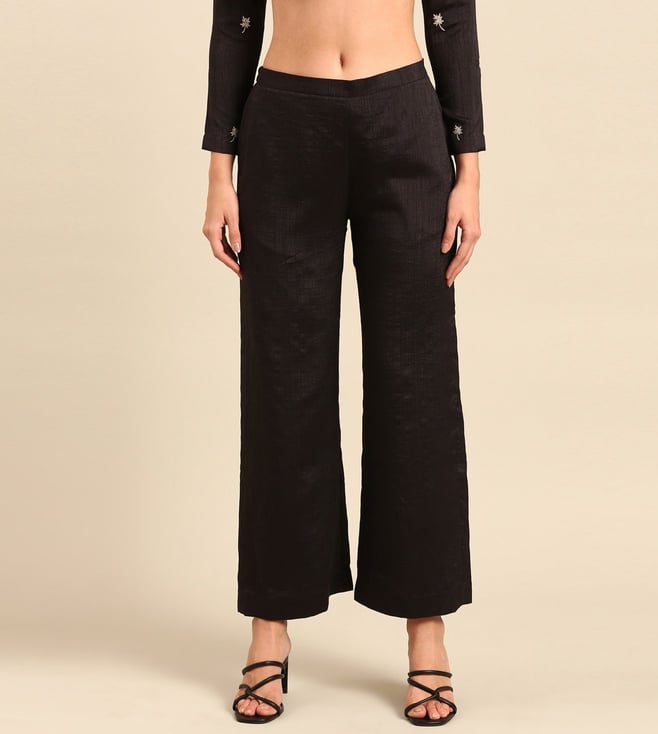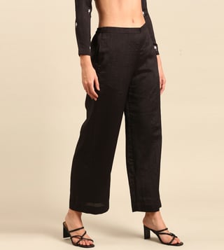 Refresh your resort wardrobe with ASMI By Mayank Modi Black Silk Cotton Slub Pants. Perfect in black, these pants will add sophistication to your look. Women can wear them for leisurely walks or while exploring local markets. Made of high-quality silk cotton slub, they provide comfort and style. Bring these pants on your next vacation and enjoy their ease and elegance.' Disclaimer: All other items in the image are only for display purposes and will not be a part of the delivery content. Product colour may slightly vary due to photographic lighting sources. Country of Origin - India.