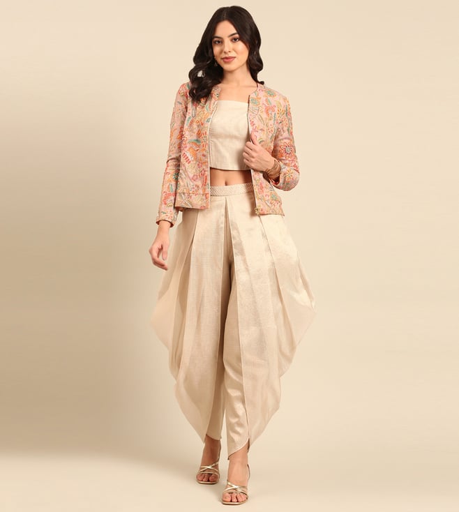 Look stylish and elegant in this ASMI By Mayank Modi Peach Print Banares Jaquard Jacket. Made from high-quality fabric, it features a beautiful peach print, full sleeves, and is perfect for resort wear. Available for women. ' Disclaimer: All other items in the image are only for display purposes and will not be a part of the delivery content. Product colour may slightly vary due to photographic lighting sources. Country of Origin - India.