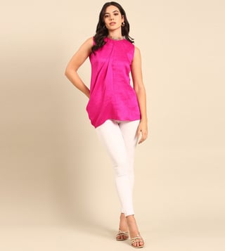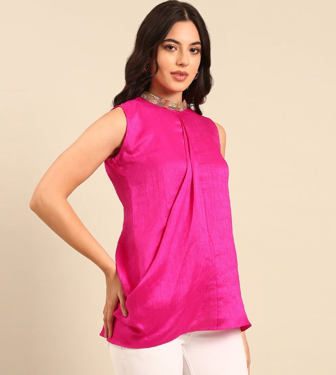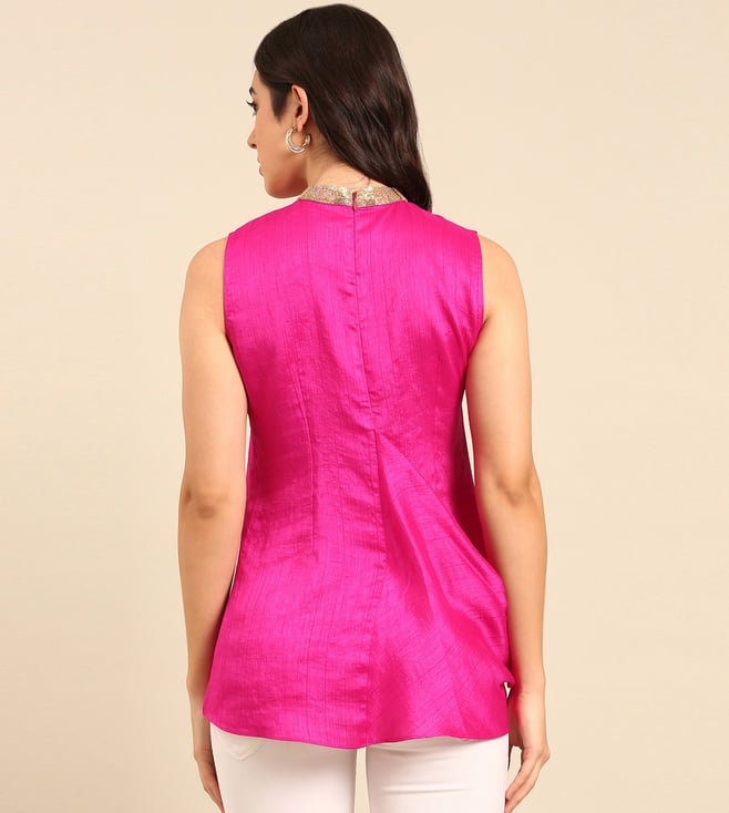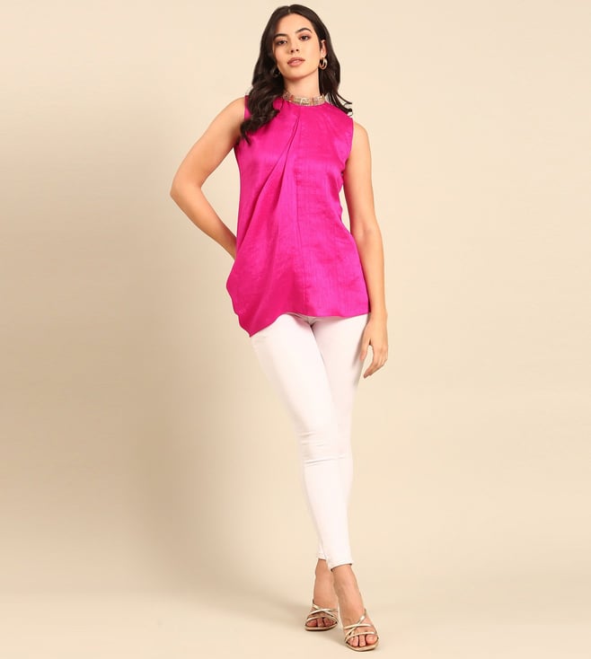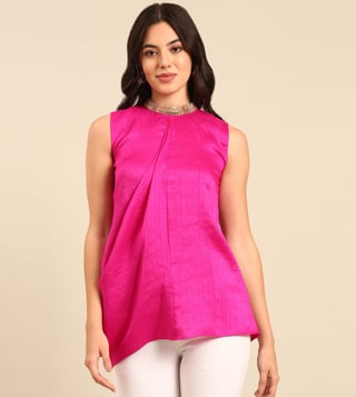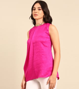 Look every bit stylish in this gorgeous ASMI By Mayank Modi pink top made from luxurious silk chiffon slub fabric. The sleeveless design and vibrant color make it perfect for a resort outing. Designed exclusively for women to amplify their style game!.' Disclaimer: All other items in the image are only for display purposes and will not be a part of the delivery content. Product colour may slightly vary due to photographic lighting sources. Country of Origin - India.