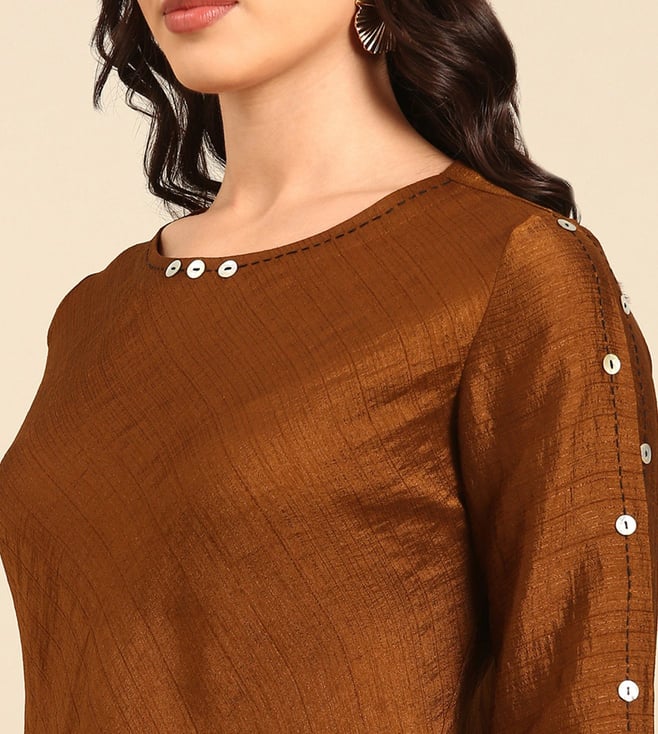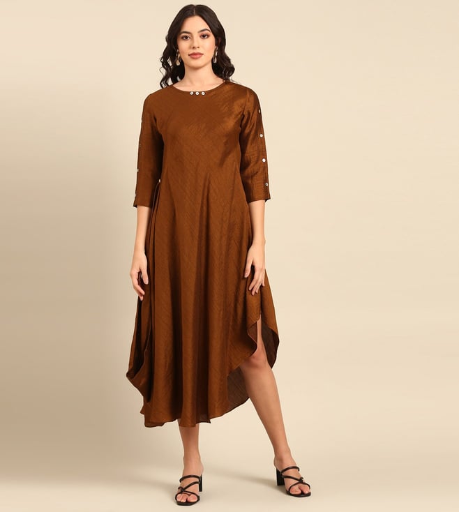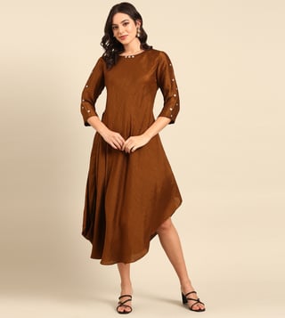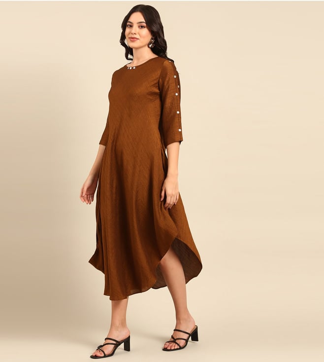 Made with Silk Cotton Slub fabric, this Rust Gold dress for Women by ASMI By Mayank is the perfect choice for resort wear. It features 3/4th sleeve design and exudes elegance and comfort. Add it to your wardrobe for a classy look.' Disclaimer: All other items in the image are only for display purposes and will not be a part of the delivery content. Product colour may slightly vary due to photographic lighting sources. Country of Origin - India.