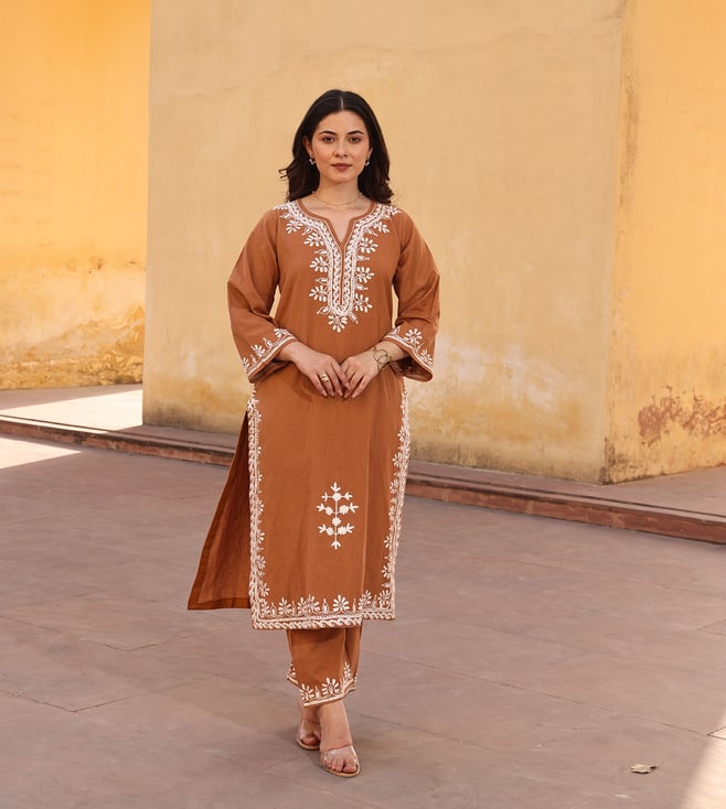 Brown Cotton Regular Fit Embroidered Suit Set