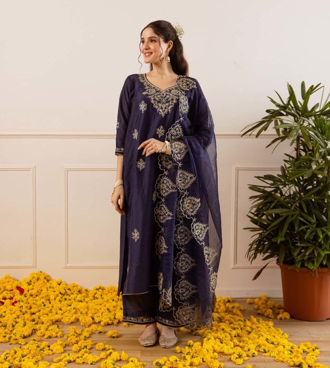Navy Blue Chanderi Regular Fit Kurta Set With Dupatta