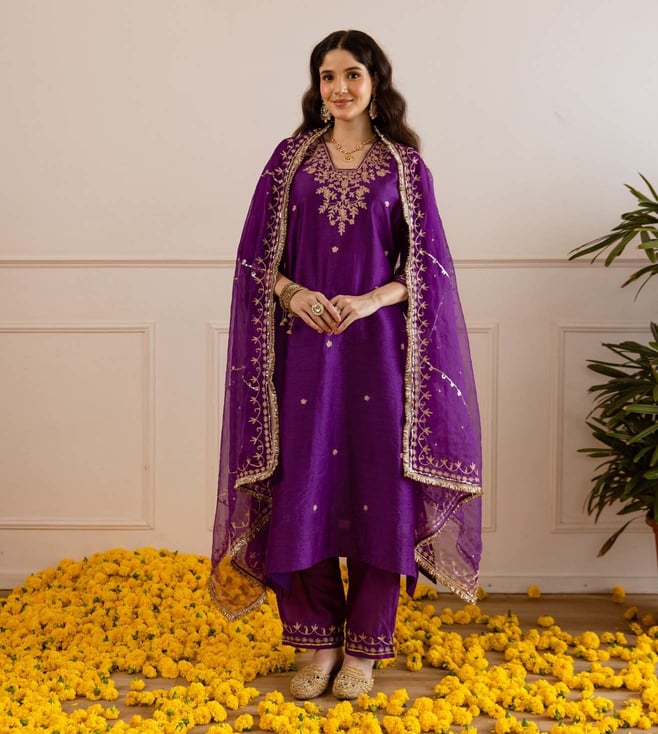 Purple Chanderi Regular Fit Kurta Set With Dupatta