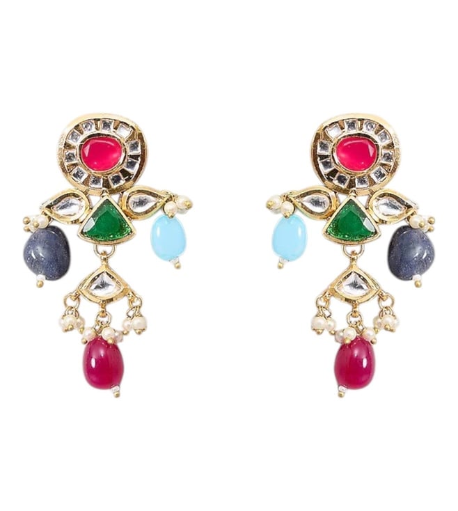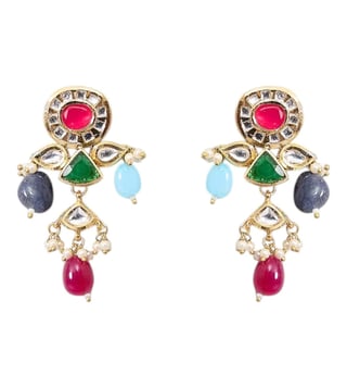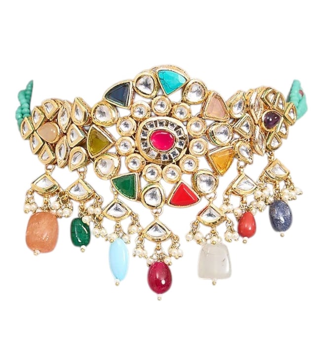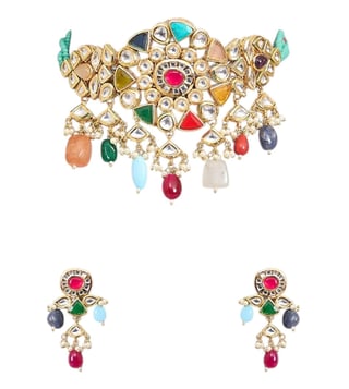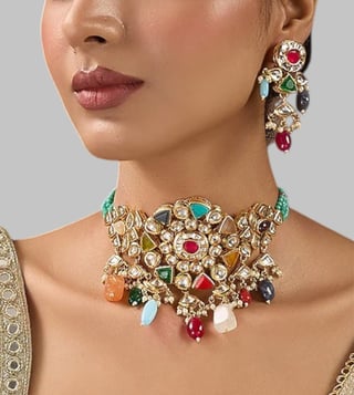 Featuring a gold finish choker necklace studded with kundan polki, multi colored semi precious stones and pearls, set in mixed metal. It is paired with a matching pair of earrings. Perfect choice for weddings or other indian festivities.