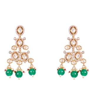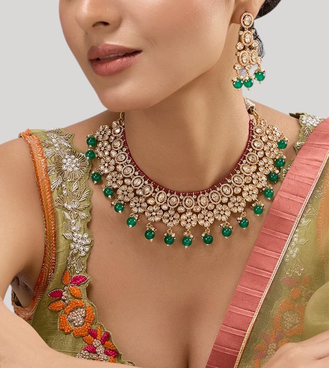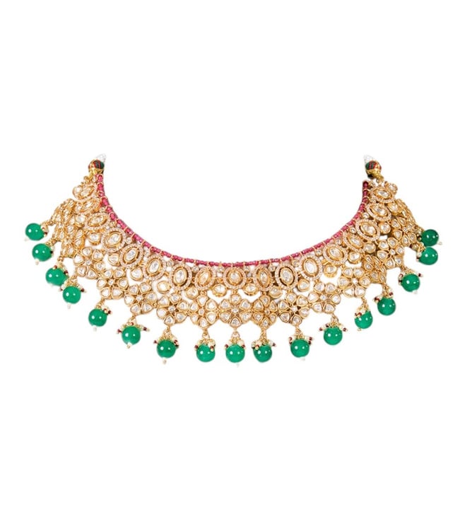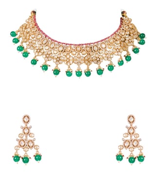 Make a stunning style statement with this handcrafted kundan choker necklace set adorned with dazzling polki style stones and elegant green glass bead hangings. The intricately designed gold plated base gives this jewelry a luxurious ethnic touch, perfect for weddings, festive occasions, and parties. The set comes with a pair of beautifully coordinated dangler earrings that enhance the regal charm of any ethnic outfit.