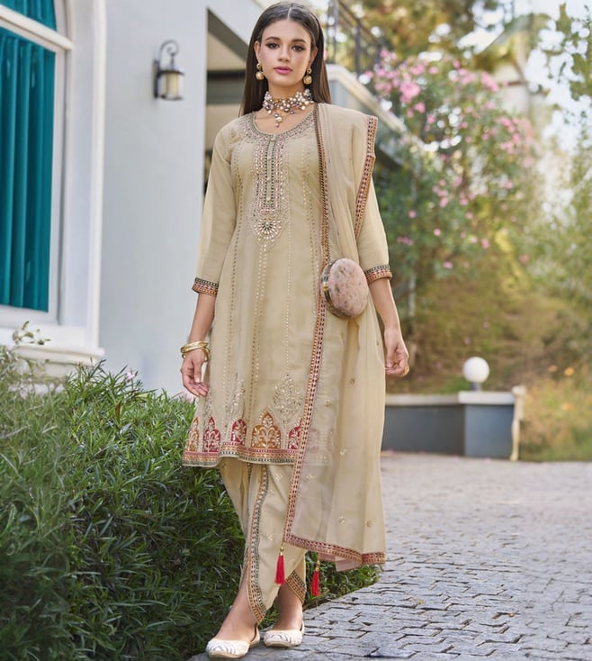 Autumnlane Beige Alia Gold Full Heavy Work Premium Kurta with Pant and Dupatta
