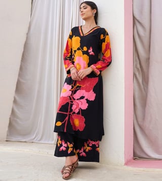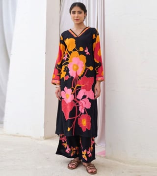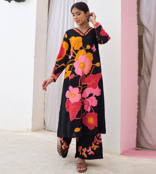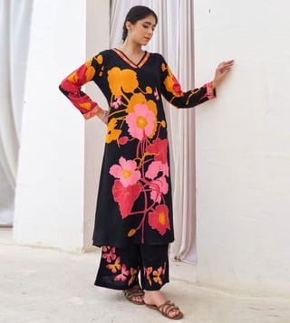Elevate your style with our Autumnlane Black Sonpal Floral Printed Regular Fit Kurta Pant Set. This stunning co-ord set is designed to bring sophistication and elegance to your wardrobe, perfect for special events or making a statement in your daily attire. With a flattering regular fit and eye-catching floral print, this set is a must-have for fashion-forward women looking to stand out. Upgrade your look and exude confidence with this chic and versatile ensemble.