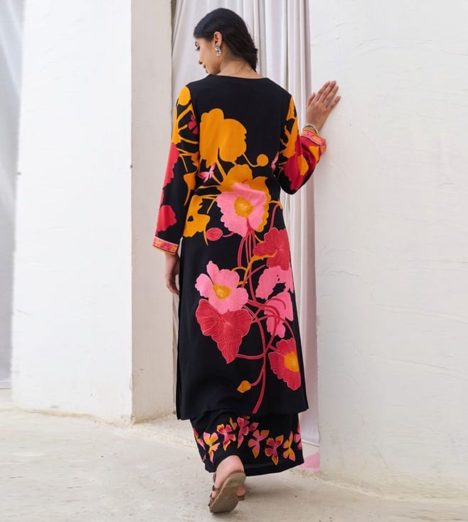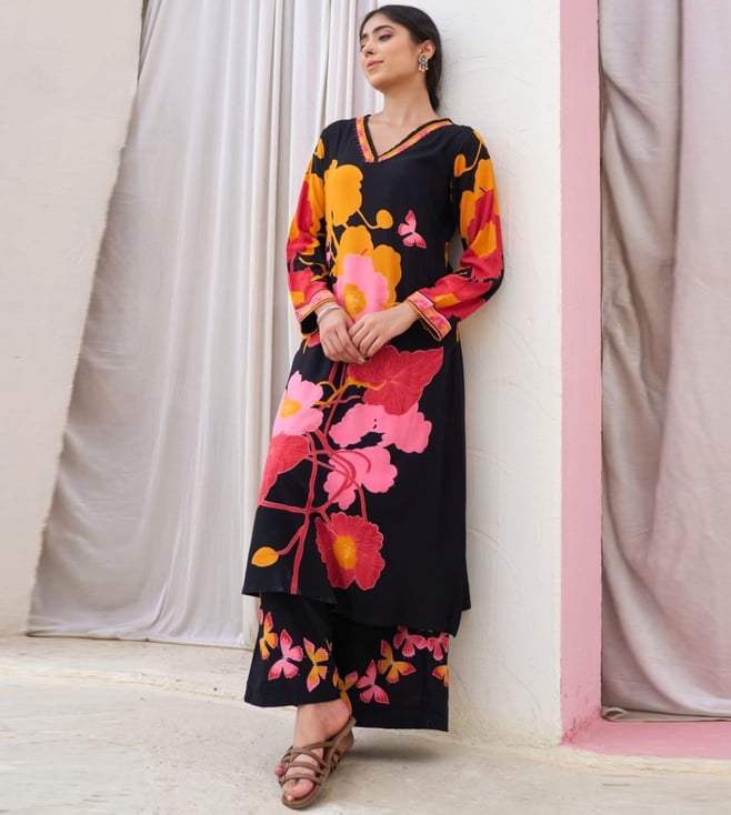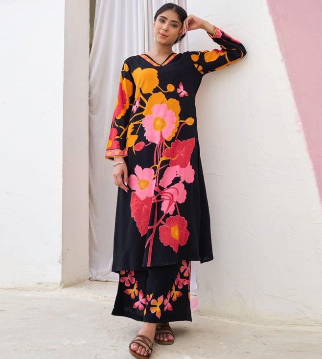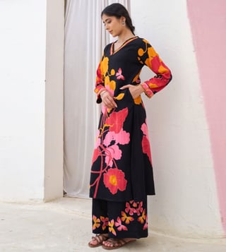 Black Sonpal Floral Printed Regular Fit Kurta Pant Set