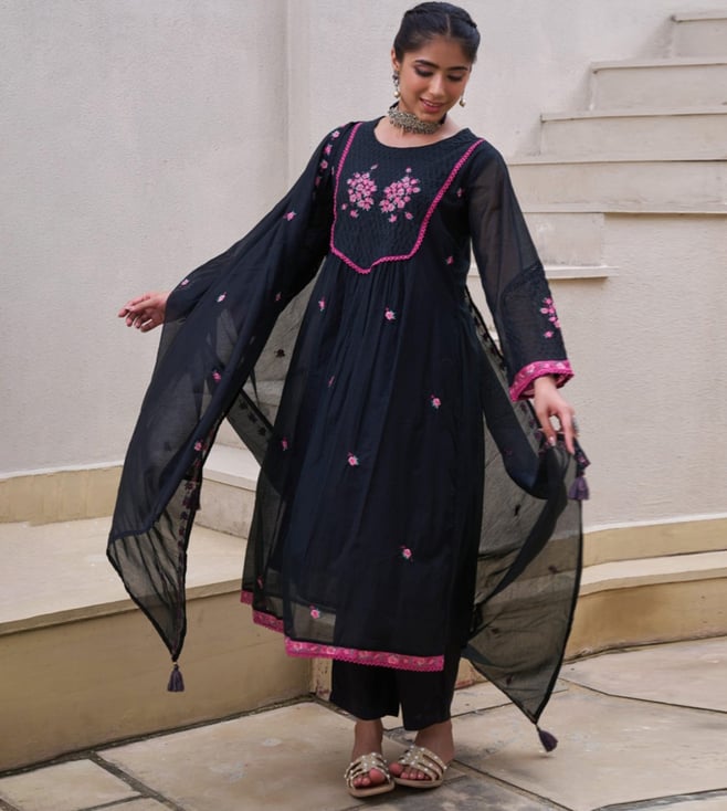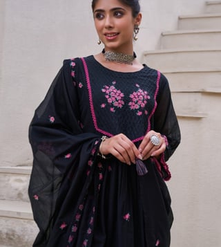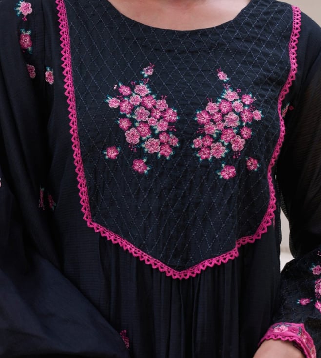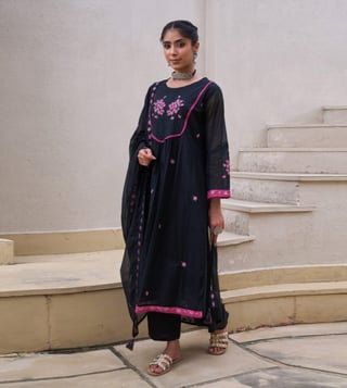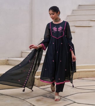 Elevate your style with the Autumnlane Black Sonpal mist Embroidered Relaxed Fit Suit Set. This sophisticated ensemble effortlessly blends comfort and elegance, with its relaxed fit and intricate Embroidered detailing. Crafted from high-quality fabric, this suit set is perfect for any special occasion or formal event. Stand out from the crowd and exude confidence in this timeless and versatile outfit. Upgrade your wardrobe with the Autumnlane Suit Set and make a statement wherever you go.