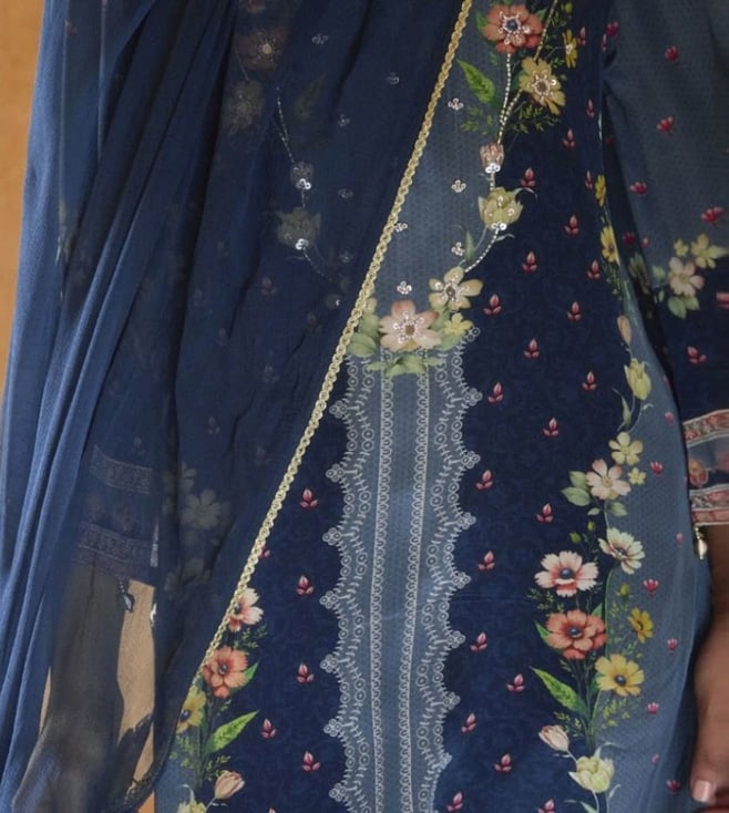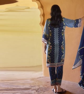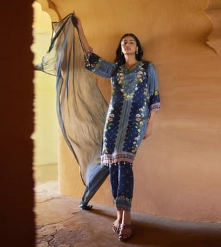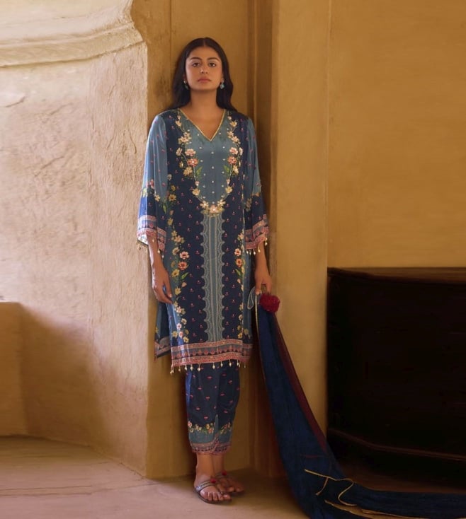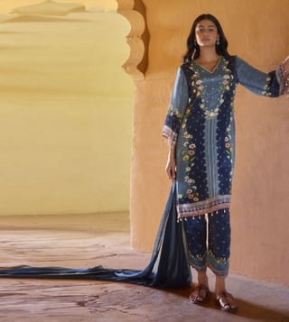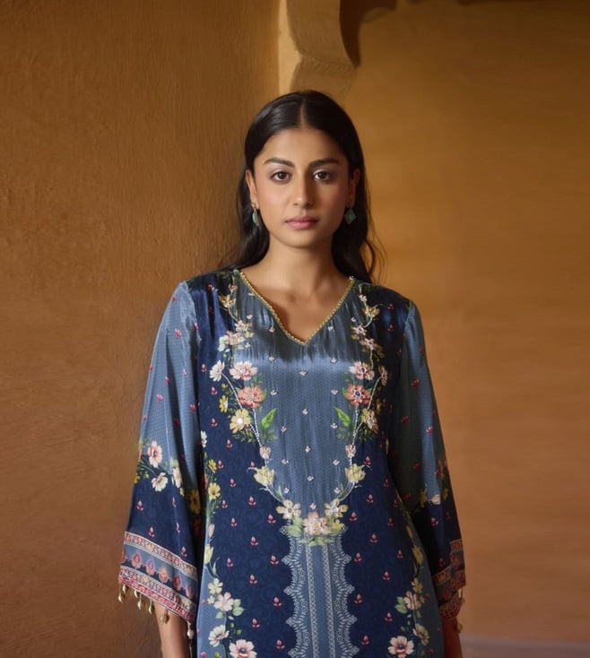 Autumnlane Blue Aster Embroidered Regular Fit Kaftan Pant Set