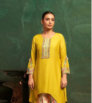 Elevate your style with our Autumnlane Canary Yellow Ira Embroidered Fusion Wear Set. This stunning co-ord set is designed to bring sophistication to your wardrobe, whether you are attending a special event or simply want to make a statement with your everyday attire. The regular fit and intricate embroidery make this set the perfect choice for fashion-forward women looking to stand out. Add a touch of vibrancy and elegance to your look with this must-have ensemble.