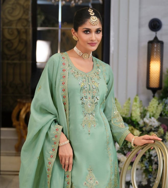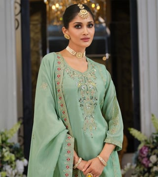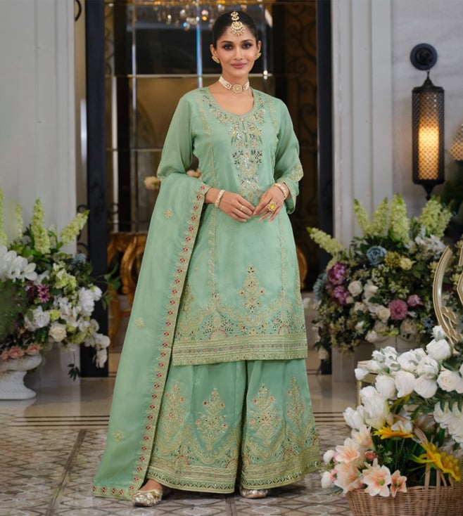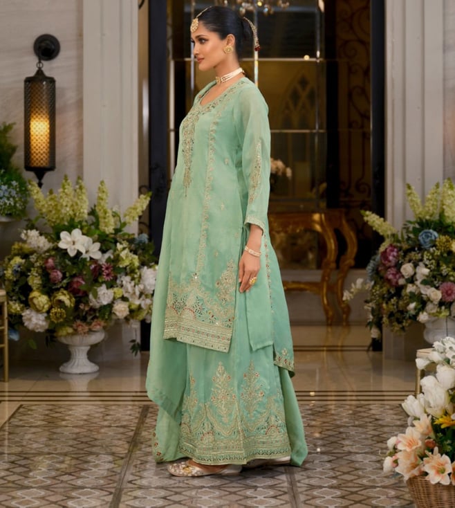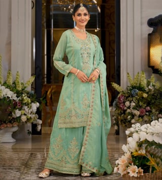 Elevate your wardrobe with our Autumnlane green tansu fern embellished Regular Fit gharara suit set. This stunning ensemble combines traditional elegance with modern comfort, featuring intricate fern embellishments and a Regular Fit that flatters all body types. Perfect for special occasions or everyday wear, this set exudes sophistication and style. Stand out from the crowd and embrace your unique sense of fashion with this must-have addition to your closet.