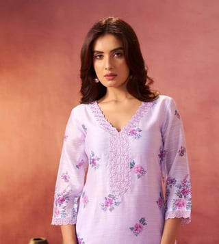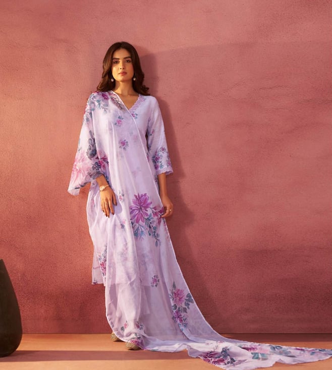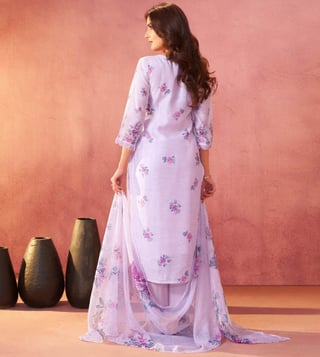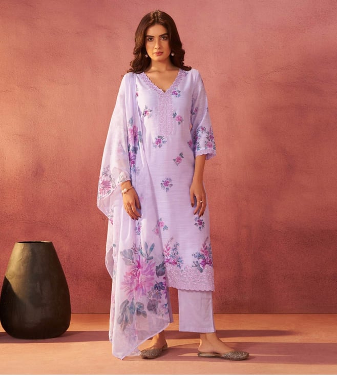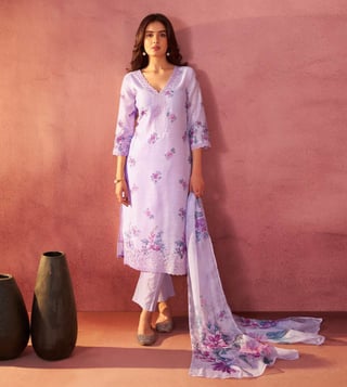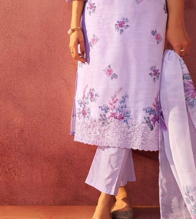 Elevate your style with our Autumnlane lavender lalitha iris embroidery suit set. This exquisite ensemble features intricate embroidery and stunning details that will make you stand out in any crowd. The soft lavender color adds a touch of elegance, while the comfortable fabric ensures you'll feel as good as you look. Perfect for special occasions or everyday ar, this suit set is a mt-have for anyone who wants to make a statement with their fashion choices. Upgrade your wardrobe with this beautiful and versatile outfit today!