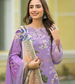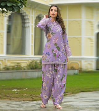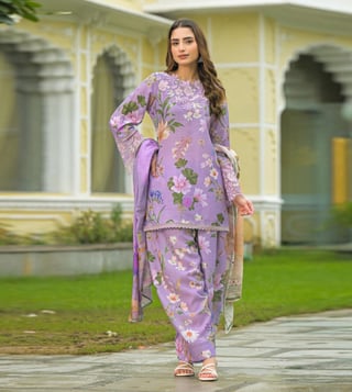 Elevate your ethnic wardrobe with Autumnlane Lavender Vastramaya farshi Floral Relaxed Fit Salwar Suit Set. This exquisite ensemble features a beautiful lavender floral print, perfect for any occasion. The relaxed fit ensures comfort without compromising on style. Crafted with high-quality fabric, this set exudes elegance and sophistication. Embrace the beauty of traditional Indian attire with a modern twist. Make a statement and stand out in this stunning salwar suit set.