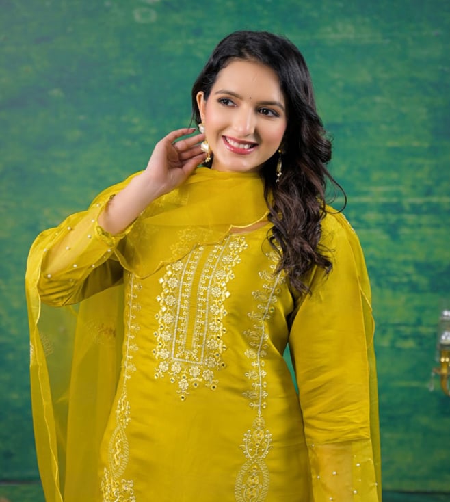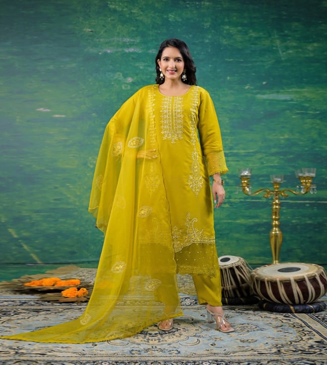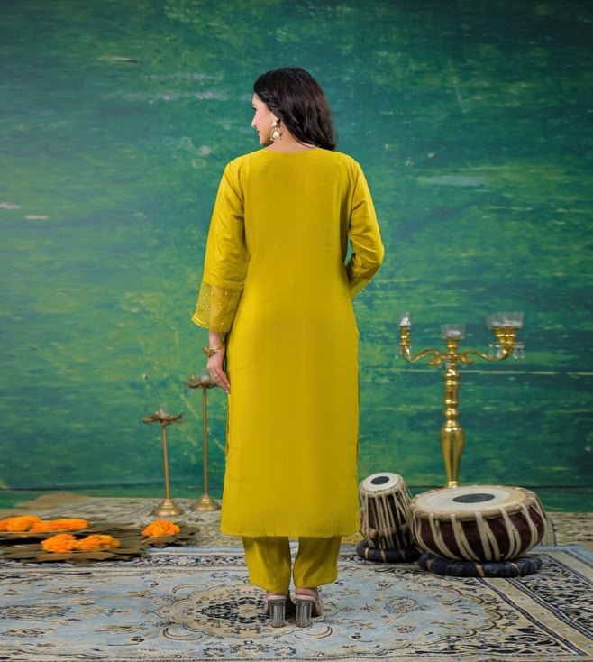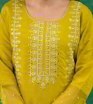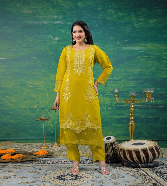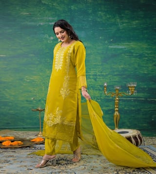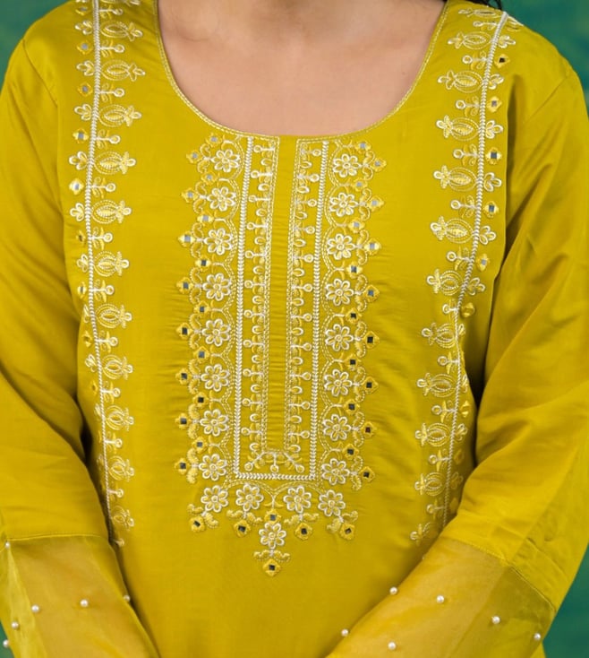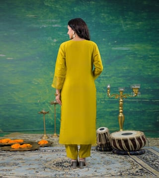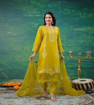 Elevate your everyday style with the Autumnlane Lime Green Mahi Wattle Embroidered Regular Fit Suit Set. Crafted from luxurious Chanderi fabric, this set features intricate embroidery on the sleeves and a flattering round neck. Perfect for daily wear, the suit set offers a comfortable fit and a pop of vibrant color to brighten up your wardrobe. Make a statement with this unique and chic ensemble that is sure to turn heads wherever you go.