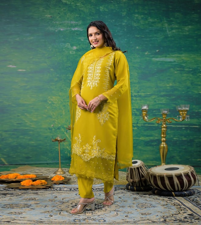 Lime Green Mahi Wattle Embroidered Regular Fit Suit Set