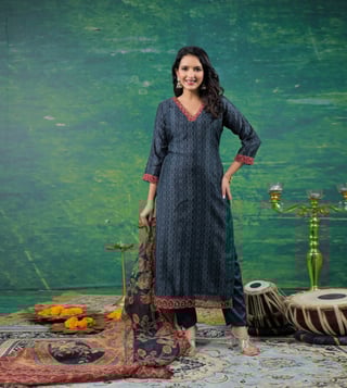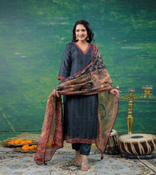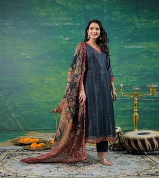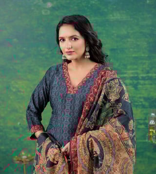 Elevate your daily wardrobe with the Autumnlane Midnight Katy Printed Regular Fit Suit Set. Made from soft cotton, this set features a flattering V-neck, three-quarter sleeves, and a stylish print that is perfect for everyday wear. The regular fit ensures comfort while maintaining a polished look. Whether you are heading to the office or out for a casual day, this suit set will keep you looking chic and feeling confident. Upgrade your style effortlessly with this versatile and fashionable ensemble.