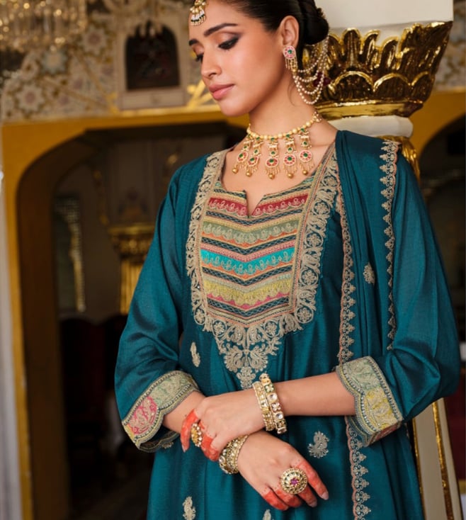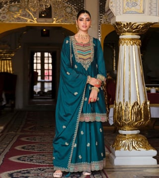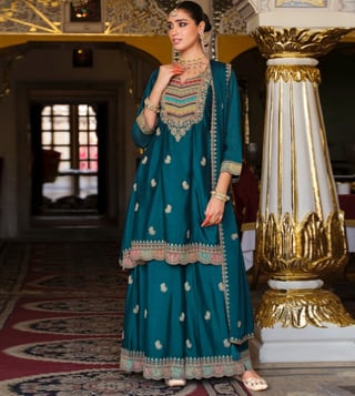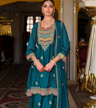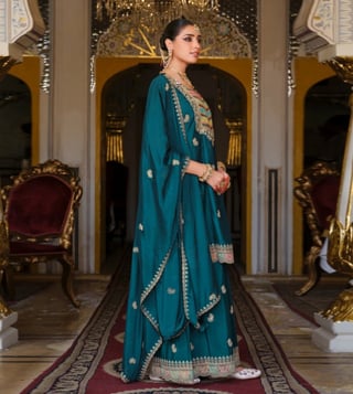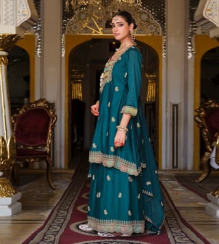 Elevate your ethnic wardrobe with Autumnlane Navy Blue Kasumal Peacock Embroidered Relaxed Fit Gharara Set. Crafted with intricate peacock Embroidered, this set exudes elegance and charm. The relaxed fit ensures all-day comfort, while the rich navy blue color adds sophistication to your look. Perfect for festive occasions or special events, this set effortlessly combines tradition with contemporary style. Stand out in the crowd and make a statement with this stunning ensemble.