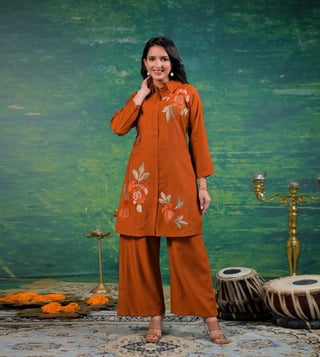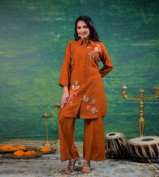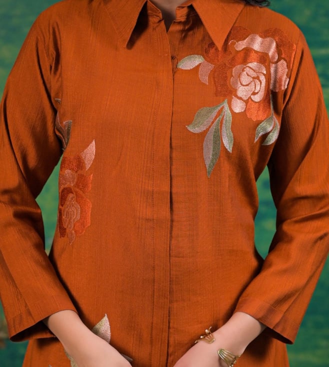 Elevate your daily wardrobe with the Autumnlane Orange Shanti Apricot Embroidered Co-Ord Set. Crafted from luxurious viscose, this set features intricate embroidery detail on a regular fit silhouette with long sleeves and a classic shirt collar. Perfect for everyday wear, this set effortlessly combines comfort and style. Stand out in the crowd with this vibrant and chic ensemble that will keep you looking on-trend and feeling fabulous all day long.