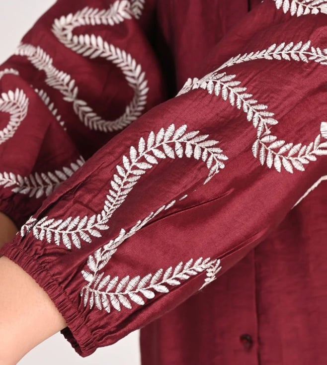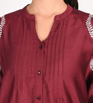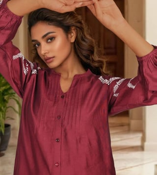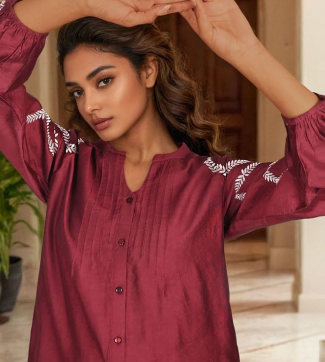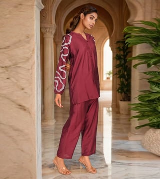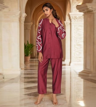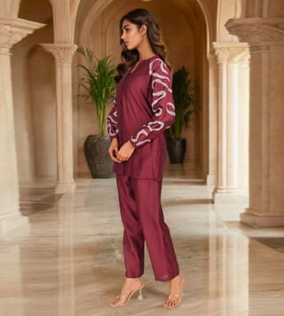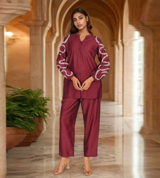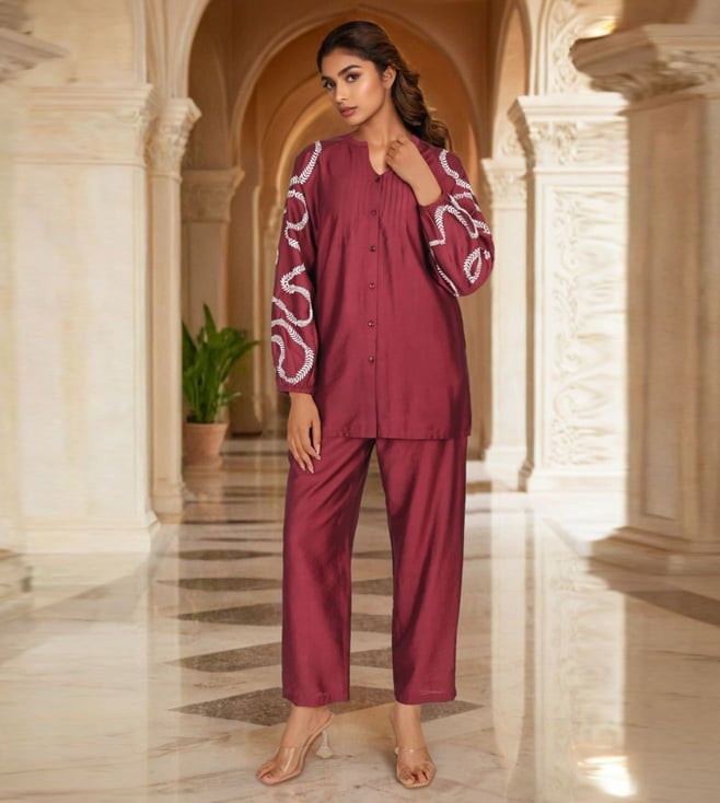 Elevate your autumn wardrobe with our Autumnlane Red Sharanya mulberry Embroidered Relaxed Fit Co-Ord Set. This luxurious set features intricate embroidery and a relaxed fit for ultimate comfort and style. Perfect for a day out or special occasion, this co-ord set effortlessly combines elegance with ease. Stand out in the crowd and make a statement with this versatile ensemble that will have you feeling confident and chic. Upgrade your fashion game with our must-have set that will have heads turning wherever you go.