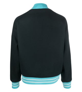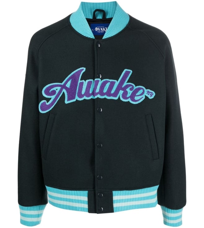 Elevate your style with the Awake Ny Black Typography Regular Fit Varsity Jacket. Logoprint woolblend bomber jacket from awake ny featuring stripe trim, logo patch to the front, front pressstud fastening, long sleeves, two front welt pockets, dark blue, wool blend, ribbed detailing and band collar. This piece fits true to size. recommend you get your regular size model is 1,84m / 6ft 1in wearing size m.